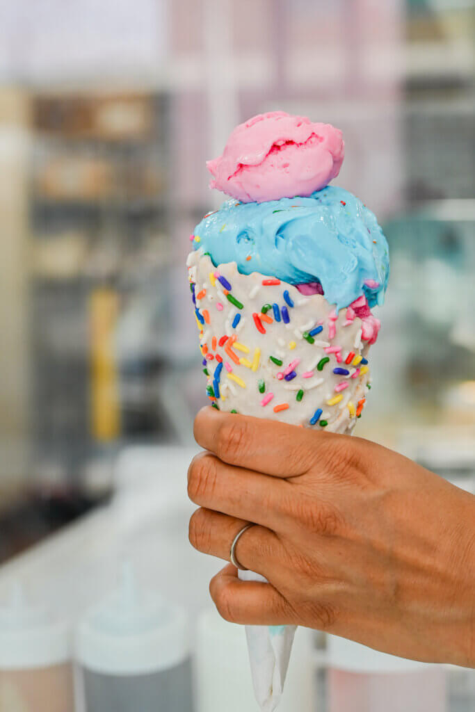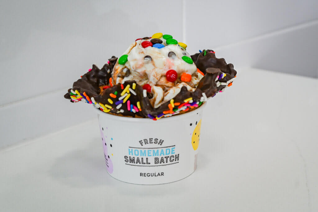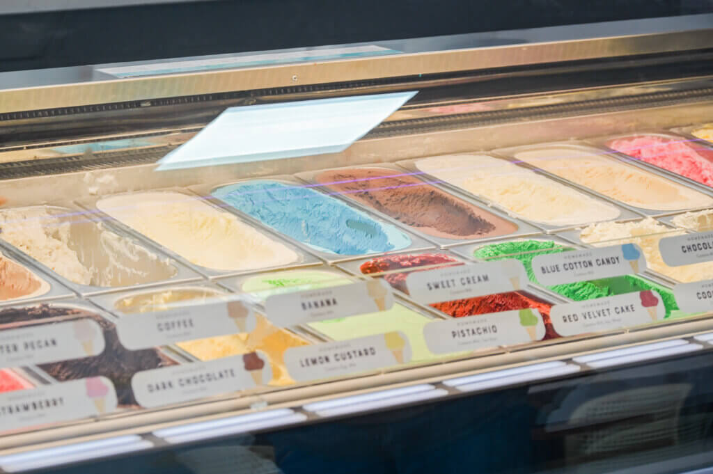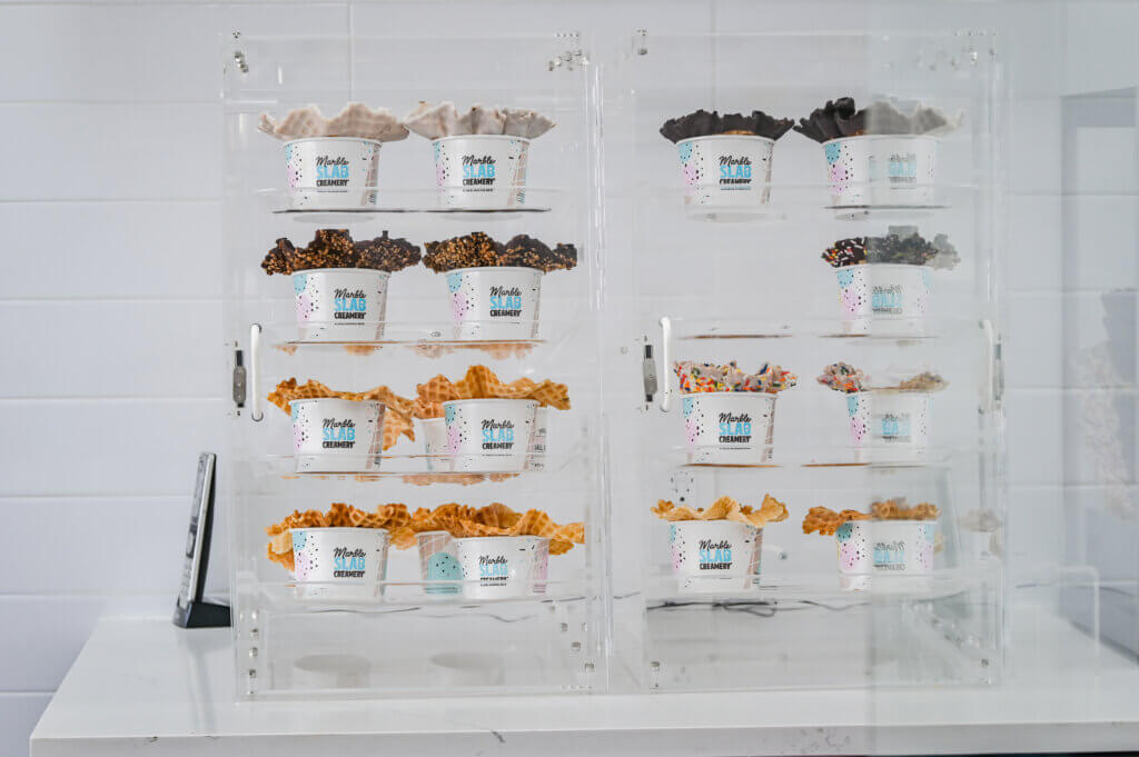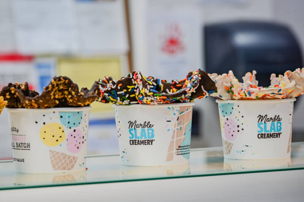 Marble Slab offers ice cream in cones and cups, as well as shakes, sundaes and ice cream cakes. Flavors vary by location, with the Round Rock site offering cotton candy, cheesecake, coffee, caramel, mango, mint, pina colada, raspberry sorbet, red velvet cake, rum, occasional seasonal flavors and more. Toppings include chocolate chips, cookie dough, gummies, M&Ms, marshmallows, nuts, sprinkles and more.