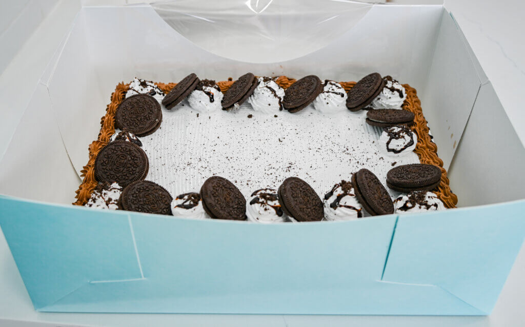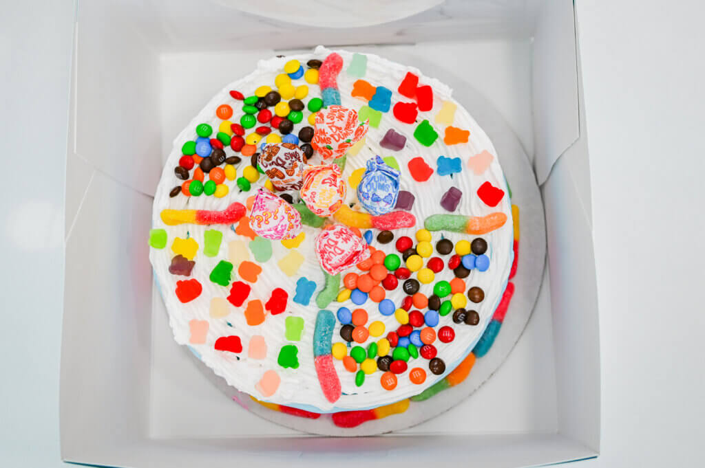 Ice cream kits are available for parties in four- and six-quart or 10-cup varieties. Ice cream cakes can be picked up ready-made or customized with 12 hours advance notice.